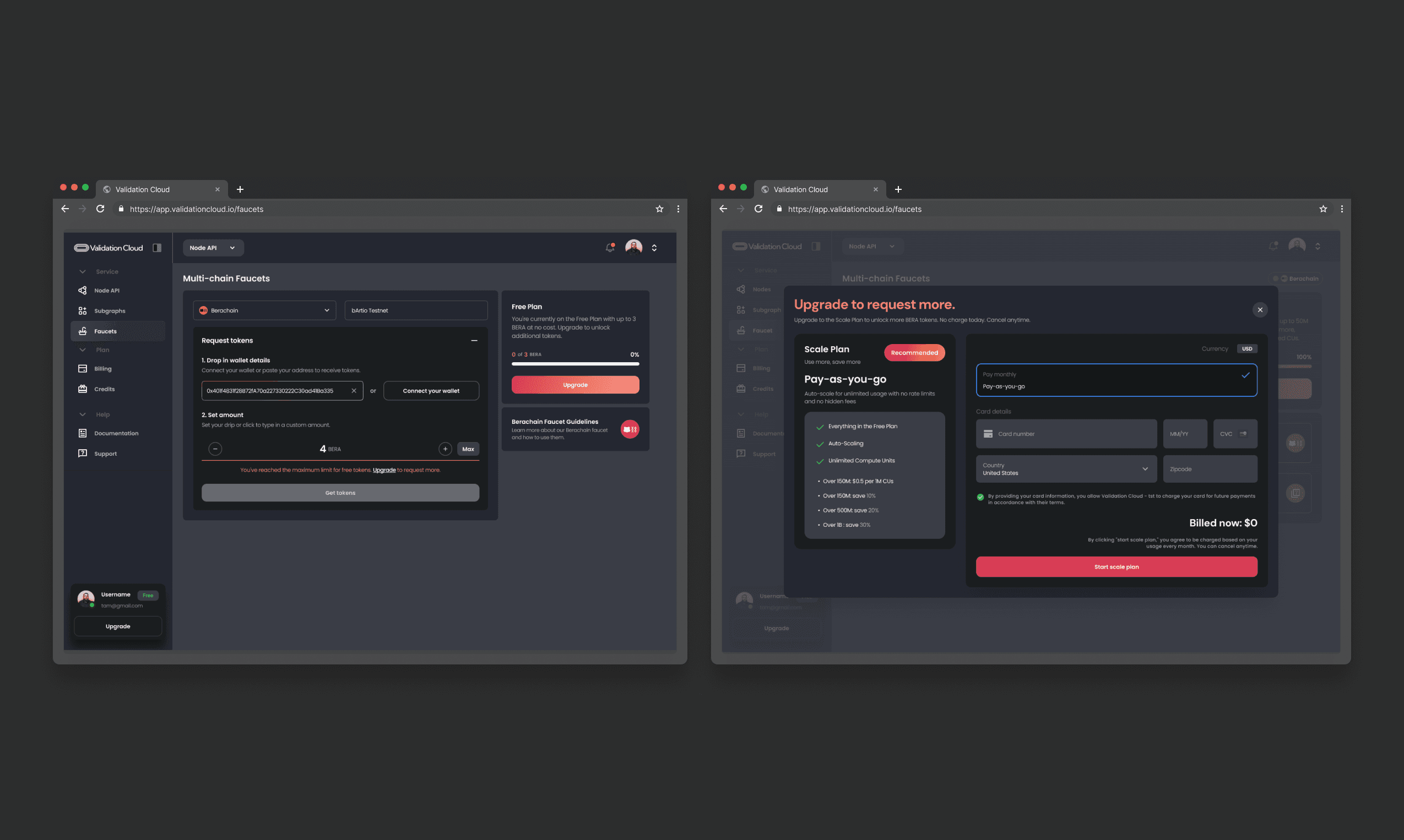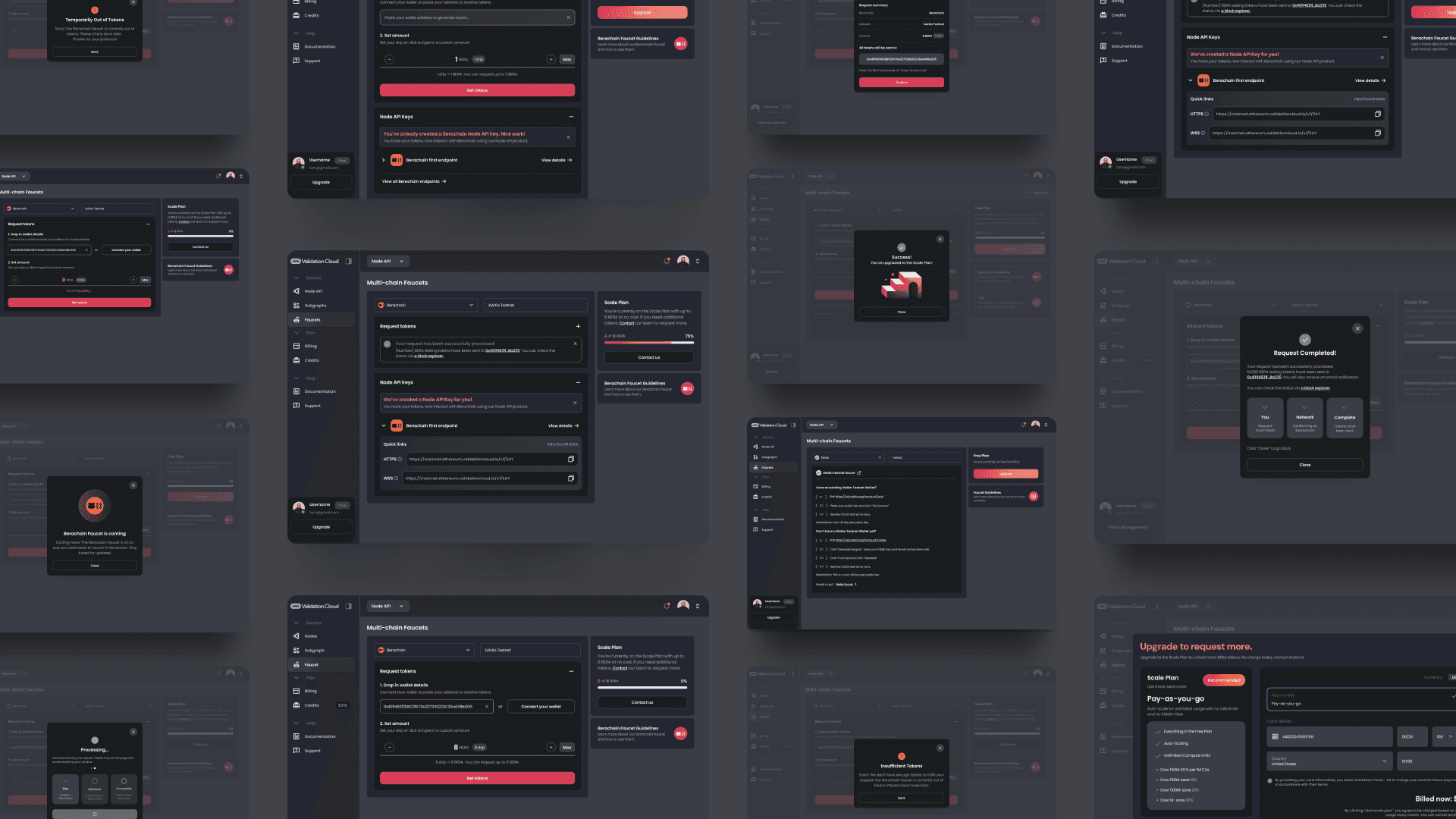 As Product Design Lead, I restructured the experience around tier based workflows for free and scale users, defined upgrade paths, and integrated automatic Node API key generation to deepen activation. I redesigned core flows for free requests, limit exceed upgrades, and higher tier allocations, while removing unnecessary constraints such as time locks and external wallet balance requirements to streamline onboarding.